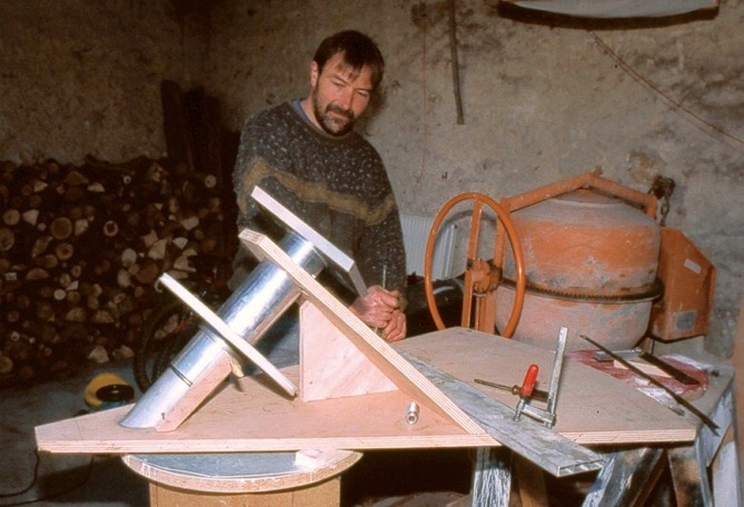 Le support de l’axe horaire est un montage délicat. L’axe est incliné à 45°. Sa rotation sera entraînée par la grande roue globique via une vis sans fin (non encore montée et visible sur le plateau). Le contact entre l’axe et la roue se fait par l’intermédiaire d’un embrayage à friction qui autorisera un mouvement manuel lors de recherches rapides. Sur l’embrayage sera fixé le cadran horaire, j’en préciserai les spécificités plus loin. Au sommet de l’axe, la platine à queue d’aronde s’emboîtera dans la base de la fourche. Sous l’axe, se logeront le moteur et la partie électronique. Un panneau de commande sera placé sur la platine triangulaire inclinée qui supporte l’axe. Au final, tout sera protégé par un carénage de bois et d’aluminium.