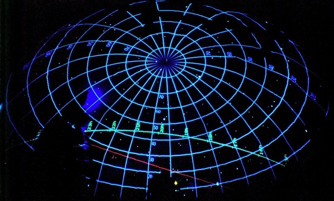 Projection des lignes de coordonnées célestes écliptique, équateur, méridien et grille de coordonnées azimutales. La grille équatoriale est également disponible.