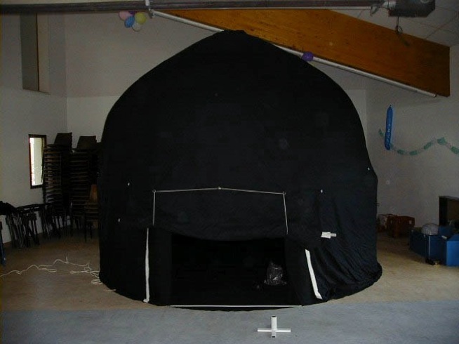 La toile noire est abaissée jusqu’en bas. La porte à enroulement est installée sur son tube.