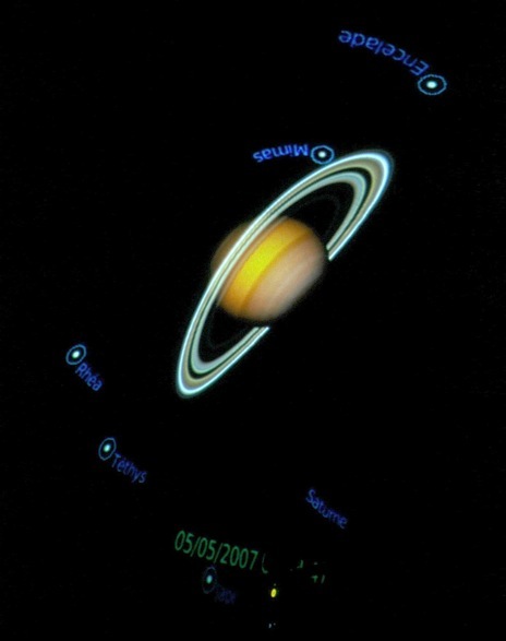La planète Saturne avec son aréopage de satellites exactement répartis et identifiés.