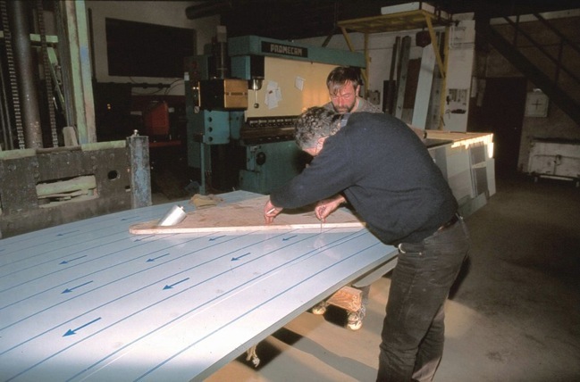 Traçage des tôles en usine. Les plaques d’aluminium sont protégées par un film plastique.